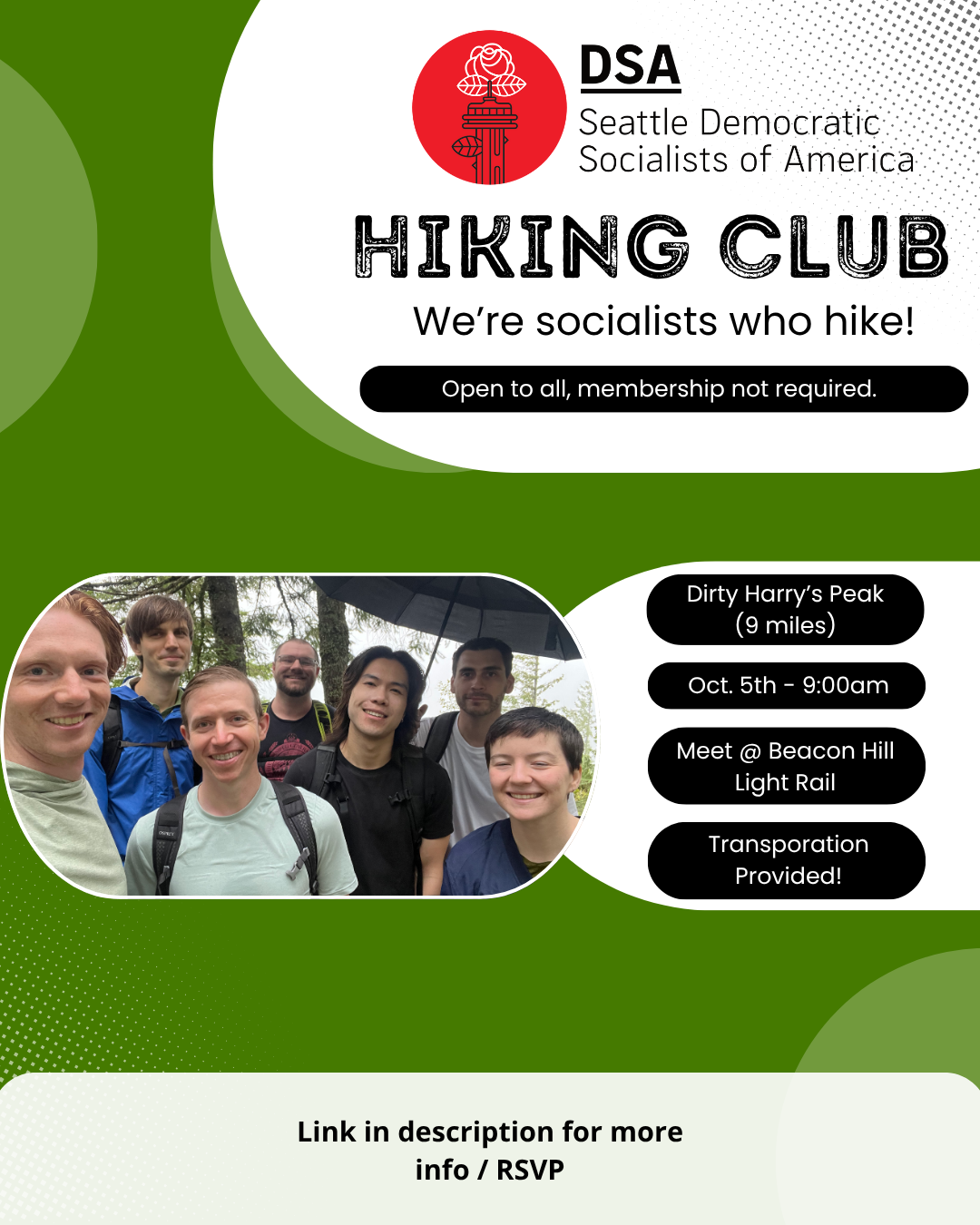 DSA Hiking Club is hosting it’s October outing up, a bit farther than previous hikes but the weather should be cool and sunny.Dirty Harry’s Peak (9 miles) When – Sunday 9:00am to 3:00pm Where – Beacon Hill light rail station